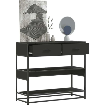 ManoManoGeneral description This console table offers ample storage space while complementing your home decor. It’s perfect for the living room, bedroom, and hallways. Technical specifications Colour: Black Material: Engineered wood, metal Overall dimensions: 90 x 35 x 80 cm (W x D x H) Maximum weight capacity (total): 60 kg Assembly required: Yes Installation To prevent it from tipping over, this product must be used with the provided wall attachment device. Usage This hall table has drawers and shelves to provide storage space for magazines, books, remote controls, and other small items. The sturdy tabletop can hold food, drinks, or decorative objects like photo frames or potted plants. Easy to maintain with a damp cloth due to its smooth surface. Other information