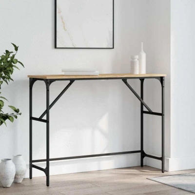 ManoManoGeneral description Add a touch of elegance to your entryway, living room, or hallway with this stylish console table. Made of high-quality engineered wood, this table features a smooth surface, strength, stability, and moisture resistance. It is easy to clean and perfect for displaying framed photos, potted plants, and other decorative items. Technical specifications Colour: Sonoma oak Material: Engineered wood, metal Dimensions: 100 x 32 x 75 cm (L x W x H) Assembly required: Yes Installation To prevent it from being overturned, this product must be used with the provided wall attachment device. Usage Ideal for placing decorative items such as framed photos and plants. Suitable for entryways, living rooms, and hallways. Other information