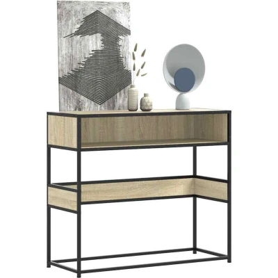 ManoManoGeneral description This console table offers ample storage space while complementing your home decor. It’s perfect for the living room, bedroom, and hallways. Technical specifications Colour: Sonoma oak Material: Engineered wood, metal Dimensions: 90 x 35 x 80 cm (W x D x H) Maximum weight capacity (total): 70 kg Assembly required: Yes Installation To prevent it from tipping over, this product must be used with the provided wall attachment device. Usage This hall table provides ample storage space for keeping your magazines, books, remote controls, and other small items within reach. The sturdy tabletop can be used to place food or drinks, or to display decorative objects like photo frames or potted plants. Thanks to its smooth surface, the hallway stand is easy to clean with a damp cloth and requires less maintenance. Other information