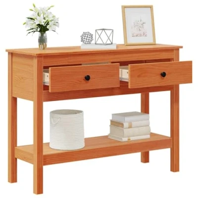 VidaXLThis Modern Console Table is a refined addition to any space, blending simplicity and utility in perfect harmony. Crafted for those who seek functionality without compromising on style, it provides a dynamic solution for display and storage. The table's clean lines and minimalist design evoke a sense of modern elegance, making it well-suited for a variety of settings, from bedrooms to hallways. With its robust structure built from solid pine wood, this table promises both aesthetic charm and dependable functionality, easily complementing contemporary and classic interiors alike. Solid Pine Material: The entire table is meticulously crafted from solid pine wood, offering a warm, natural finish that brings a touch of the outdoors into your home. This choice of material ensures a long-lasting build, able to withstand the demands of daily use while maintaining its sophisticated appearance. Spacious Board Shelves: Features two board shelves, providing ample space to display decorative items such as vases, books, or collections. These shelves are designed to be practical and adaptable, allowing you to rearrange as per your needs without compromising on style. Functional Drawers: Includes solid pine drawers that not only enhance the natural look of the piece but also allow for discreet storage. Perfect for holding smaller items like keys, mail, or office supplies, these drawers make organization both easy and efficient. Modern Aesthetic: Characterized by clean lines and minimal ornamentation, it fits seamlessly into modern design schemes. This versatility ensures it serves as a timeless piece that can be integrated into various decor styles effortlessly, enhancing the overall appeal of your living space. Care Instructions: Maintaining its pristine look is as simple as wiping it with a dry cloth. This straightforward care routine helps preserve the elegance and life of the table, safeguarding your investment while ensuring it remains a stunning focal point in your home.