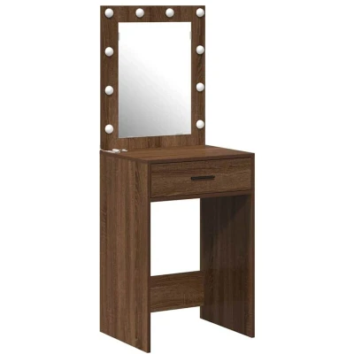 ManoManoGeneral description This modern dressing table in brown oak combines simplicity and functionality, making it a perfect fit for any bedroom style. Its neat design with clean lines exudes understated elegance, ideal for contemporary spaces. The built-in LED lights provide excellent brightness, perfect for tasks like makeup application or hairstyling, creating a salon-like atmosphere at home. With spacious storage options, it keeps your personal items organized and easily accessible. Technical specifications Colour: Brown oak Material: Engineered wood Overall dimensions: 50 x 41 x 135 cm (L x W x H) Weight: 18 kg Power source: Plug Number of drawers: 2 Includes: Plane mirror Indoor use only Assembly required: Yes EAN: 8721158850713 SKU: 865043 Brand: vidaXL Other information Use only certified DC 5V input. Higher voltage may cause overheating and damage to the device. Not suitable for children under 14 years or individuals with reduced capabilities. Electricity is dangerous; ensure