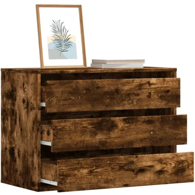 General description This classic chest of drawers, featuring a timeless look, is an excellent addition to your home. Made from high-quality engineered wood, it offers durability and a smooth surface, ensuring strength, stability, and resistance to moisture. The drawer chest is easy to clean with a damp cloth. Technical specifications Colour: Smoked oak Material: Engineered wood Dimensions: 80 x 41 x 58 cm (W x D x H) Assembly required: Yes Usage Ample storage space: The storage cabinet features 3 drawers, providing ample space for organizing your daily essentials. Displaying function: The top of the sideboard cabinet is ideal for showcasing decorative items, photo albums, or small plants. Other information Warning: To prevent tipping, this product must be used with the provided wall attachment device. Images: