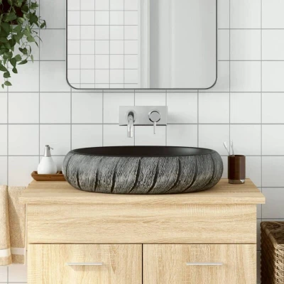vidaXL Countertop Basin Black and Grey Oval Ceramic Impression Making, Durable, Easy to Clean Handmade Bathroom Sink