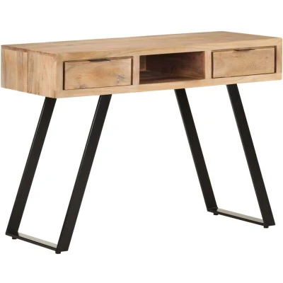 General description This wooden desk exudes industrial charm and will make a timeless addition to your home. Made of solid acacia wood, a hardwood with dense grains, it is stable and durable. The steel frame adds extra stability. The desk features two drawers and a compartment, providing ample space for storing small items such as keys, notebooks, and other knick-knacks. It can also be used as a writing desk or console table. Important note: Colours and grains may vary from piece to piece, making each piece unique. Technical specifications Material: Solid acacia wood with a natural finish, steel with black finish Dimensions: 107 x 45 x 79 cm (L x W x H) Assembly required: Yes SKU: 323523 Other information