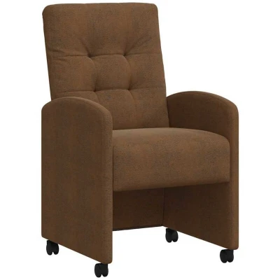 These dining chairs offer a contemporary touch to your dining room. Their modern style, characterized by simplicity and function, is visually pleasing with clean lines and minimal ornamentation. Made for indoor use, the chairs fit seamlessly into any dining setting, ensuring both aesthetic appeal and comfort. Tailored from faux suede leather, these chairs not only look the part but also provide a durable seating solution ideal for family meals or entertaining guests. Their ergonomic design enhances the dining experience. Premium Materials: The dining chairs are upholstered with faux suede leather that offers both elegance and resilience, allowing them to withstand daily use while maintaining their luxurious aesthetic. In tandem with this, metal and plywood in the frame ensure robustness and longevity, making the chairs a stable choice for households that value quality. Ergonomic Comfort: Designed with an ergonomic focus, these chairs provide superior comfort with their precisely cushioned foam padding. The flat armrests encourage relaxation, making them the perfect choice for leisurely meals and extended periods of dining. This thoughtful design ensures that mealtime is enjoyable for family members and guests alike. Functional Mobility: Featuring wheels and casters, these dining chairs provide excellent mobility, allowing easy relocation and configuration within your dining area. This makes them particularly useful in open-plan spaces where functionality and versatility are paramount. Effortless Assembly: Provided in a set of two, these dining chairs require simple assembly using a screwdriver. Delivery includes all necessary components and instructions, streamlining the process while ensuring you enjoy their use without delay. Indoor Utility: Meant for indoor use, these chairs integrate seamlessly into dining room environments, providing both style and comfort without compromising on space or utility. Their construction fits a variety of dining tables, making them a suitable addition to both modern and traditional settings.