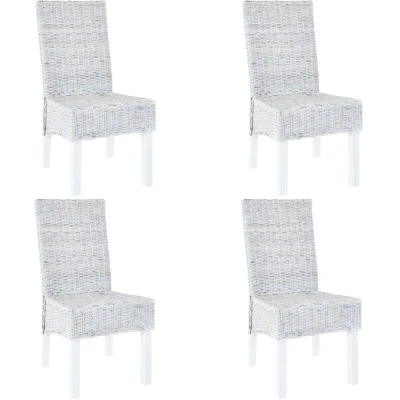 General description This Kubu rattan dining chair set features a simple design and a perfectly coordinated white color, enhancing the beauty of your dining room. The mango wood frames and genuine weave provide structural stability and aesthetic appeal. The rattan-covered seats offer comfort and are easy to clean, making this handwoven chair set an excellent choice for complementing your kitchen or dining room decor. Technical specifications Colour: White Material: Kubu rattan and mango wood Leg colour: White wash Dimensions: 46 x 61 x 93 cm (W x D x H) Seat width: 46 cm Seat depth: 41.5 cm Seat height from the ground: 46 cm Maximum weight capacity: 110 kg per seat Handmade Easy to assemble Delivery includes 4 dining chairs Other information