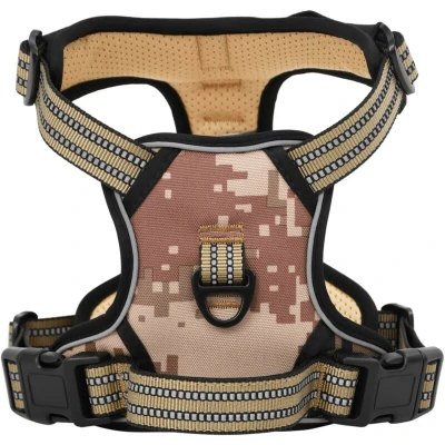 ManoManoGeneral description Say goodbye to pulling and hello to better control with our easy-to-use dog harness. Give your furry friend the best walking experience! This harness is designed for comfort and safety, featuring reflective stripes for high visibility during walks. Technical specifications Colour: Camouflage brown Material: Polyester Size: M Neck girth: 41 - 56 cm Chest girth: 38 - 71 cm Weight: 256 g Number of leash rings: 2 4 adjustable straps Reflective stripes Top safety handle Installation Easy to put on and take off with 2 quick-release buckles. Simply slide the harness over your dog's head, fasten the buckles, and adjust the straps for a perfect fit. Usage No Pull & No Choke: Features two leash rings for safer walks. Use the front clip to stop pulling during training, while the back ring is ideal for everyday walks, jogging, and hiking. Safe and comfortable: Made of polyester and padded with a soft cushion to protect your dog's skin. The breathable air mesh keeps your dog