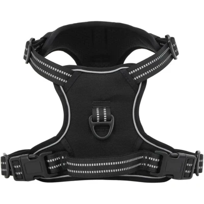 Say goodbye to pulling and hello to better control with our easy-to-use dog harness. Give your furry friend the best walking experience! Easy to put on and take off: This dog harness is easy to put on and take off with its 2 quick-release buckles. Simply slide the harness over your dog's head, fasten the buckles, adjust the straps, and you're good to go!Fully adjustable: This dog harness has 4 adjustable straps for a perfect fit. Customise the 2 neck and 2 chest straps for comfort and room to grow! Your dog will stay secure without slipping out or feeling choked, thanks to the even distribution of pulling force across their body.No Pull & No Choke: This dog harness has two leash rings for safer dog walks. Use the front clip to stop pulling during training, while the back ring is great for everyday walks, jogging, hiking, and more.Safe and comfortable: This dog harness is made of polyester and padded with a soft cushion to protect your dog's skin. Also, the breathable air mesh keeps your dog cool and comfy all day.Reflective strips for high visibility: This dog harness features reflective strips on its surface, ensuring a safe walk both day and night. Good to know:This product is suitable for machine and hand washing, for best results and to extend its lifespan, hand washing is recommended.