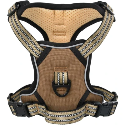 ManoManoGeneral description Say goodbye to pulling and hello to better control with our easy-to-use dog harness. Give your furry friend the best walking experience! This dog harness is designed for comfort and safety, making walks enjoyable for both you and your pet. Technical specifications Colour: Brown Material: Polyester Size: L Neck girth: 46 - 66 cm Chest girth: 43 - 86 cm Lead size: 180 x 2.5 cm (L x W) Adjustable dog collar circumference: 43 - 73 cm Harness weight: 289 g Collar weight: 81 g Number of leash rings: 2 4 adjustable straps Reflective stripes for high visibility Top safety handle Installation Easy to put on and take off with 2 quick-release buckles. Simply slide the harness over your dog's head, fasten the buckles, and adjust the straps for a perfect fit. Usage No Pull & No Choke: Features two leash rings for safer dog walks. Use the front clip to stop pulling during training, while the back ring is ideal for everyday walks, jogging, and hiking. Machine and hand washable;