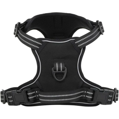 ManoManoGeneral description Say goodbye to pulling and hello to better control with our easy-to-use dog harness. Give your furry friend the best walking experience! Technical specifications Colour: Black Material: Polyester Size: M Neck girth: 41 - 56 cm Chest girth: 38 - 71 cm Weight: 256 g Number of leash rings: 2 4 adjustable straps Reflective stripes Top safety handle Installation Easy to put on and take off with 2 quick-release buckles. Simply slide the harness over your dog's head, fasten the buckles, adjust the straps, and you're good to go! Usage No Pull & No Choke: Features two leash rings for safer dog walks. Use the front clip to stop pulling during training, while the back ring is great for everyday walks, jogging, hiking, and more. Safe and comfortable with a soft cushion to protect your dog's skin and breathable air mesh to keep your dog cool. Reflective strips ensure high visibility for safe walks both day and night. Other information This product is suitable for machine and