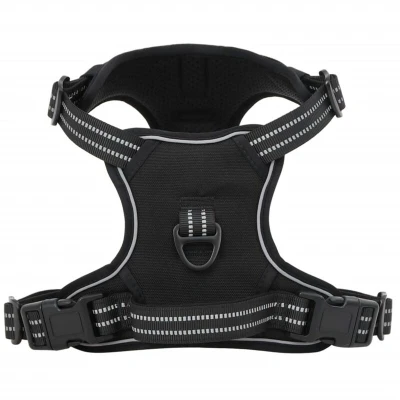 ManoManoGeneral description Say goodbye to pulling and hello to better control with our easy-to-use dog harness. Give your furry friend the best walking experience! Technical specifications Colour: Black Material: Polyester Size: XL Neck girth: 58 - 89 cm Chest girth: 53 - 96 cm Weight: 314 g Number of leash rings: 2 4 adjustable straps Reflective stripes Top safety handle Installation Easy to put on and take off with 2 quick-release buckles. Simply slide the harness over your dog's head, fasten the buckles, adjust the straps, and you're good to go! Usage No Pull & No Choke: Features two leash rings for safer dog walks. Use the front clip to stop pulling during training, while the back ring is great for everyday walks, jogging, hiking, and more. Safe and comfortable: Made of polyester and padded with a soft cushion to protect your dog's skin. Breathable air mesh keeps your dog cool and comfy all day. Reflective strips ensure high visibility for safe walks both day and night. Other information