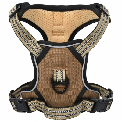 ManoManoGeneral description Say goodbye to pulling and hello to better control with our easy-to-use dog harness. Give your furry friend the best walking experience! Technical specifications Colour: Brown Material: Polyester Size: XL Neck girth: 58 - 89 cm Chest girth: 53 - 96 cm Weight: 314 g Number of leash rings: 2 4 adjustable straps Reflective stripes Top safety handle Installation Easy to put on and take off with 2 quick-release buckles. Simply slide the harness over your dog's head, fasten the buckles, adjust the straps, and you're good to go! Usage No Pull & No Choke: Features two leash rings for safer dog walks. Use the front clip to stop pulling during training, while the back ring is great for everyday walks, jogging, hiking, and more. Safe and comfortable: Made of polyester and padded with a soft cushion to protect your dog's skin. Breathable air mesh keeps your dog cool and comfy all day. Reflective strips ensure high visibility for safe walks both day and night. Other information