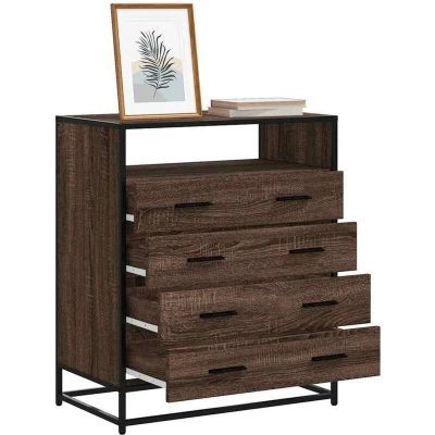 ManoManoGeneral description This stylish drawer cabinet in brown oak adds an elegant charm to your interior while providing ample storage space. With a well-designed structure, it features a stable metal frame that enhances its industrial style and ensures exceptional durability. Technical specifications Colour: Brown oak Material: Engineered wood, metal Dimensions: 70 x 41 x 83.5 cm (W x D x H) Maximum weight capacity (total): 70 kg Assembly required: Yes Installation To prevent tipping, this product must be used with the provided wall attachment device. Usage The cabinet features 4 large drawers for organizing daily essentials. The sturdy top is ideal for displaying potted plants, framed photos, and other decorative items. Easy to clean with a damp cloth. Other information