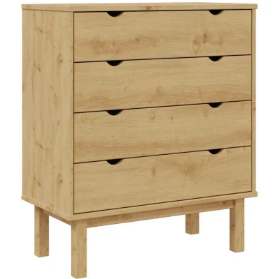 ManoManoGeneral description This classic wooden drawer cabinet is a perfect choice for adding a Scandinavian style to your home decor. Made from solid pine wood, it features a beautiful natural finish with a straight grain and rustic knots, ensuring both aesthetic appeal and durability. Technical specifications Material: Solid pine wood, engineered wood Dimensions: 76.5 x 39.5 x 90 cm (W x D x H) Number of drawers: 4 Legs: 4 wooden legs Range: OTTA Installation Each product comes with an assembly manual in the box for easy assembly. To prevent overturning, this product must be used with the wall attachment device provided. Other information