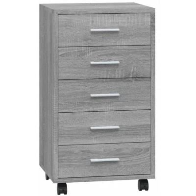 This modern, stylish drawer cabinet with castors will make a perfect, practical storage solution for any office or study. Durable material: The engineered wood is of exceptional quality with a smooth surface and also features strength, stability and resistance to moisture. Ample storage space: The cabinet has 5 drawers, providing ample storage space for documents, notebooks, pens, paper clips, keys and other office supplies. Flexible design: Thanks to its 4 wheels, the drawer chest can be flexibly placed and easily moved around. This storage cabinet is also a perfect match for a computer desk as well as an excellent piece of furniture for your kid's room. Colour: Grey sonoma/Material: Engineered wood, aluminium/Dimensions: 33 x 38 x 63 cm (W x D x H)