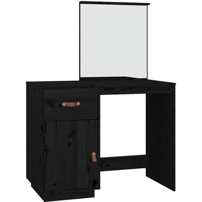 General description The wooden dressing table with mirror is a great addition to your bedroom decor while keeping your cosmetics close at hand. Made from solid pine wood, it features a beautiful natural material with a straight grain and rustic knots. The ample storage includes a drawer and two compartments, providing organized space for your makeup items. The included mirror offers a clear view for makeup application and adds an elegant touch to the vanity desk. A practical door helps keep your essentials free from dust. Technical specifications Colour: Black Material: Solid pine wood, acrylic Dimensions: 95 x 50 x 134 cm (W x D x H) SKU: 820091 Other information Warning: In order to prevent overturning, this product must be used with the wall attachment device provided. Each product comes with an assembly manual in the box for easy assembly.
