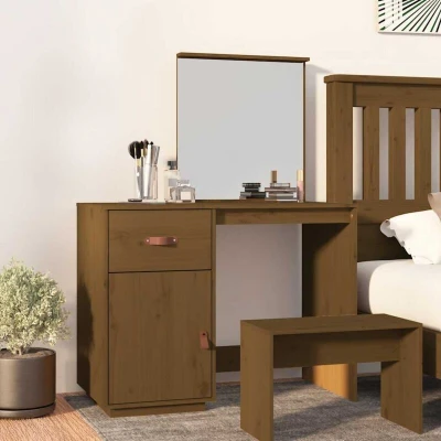 VidaXLThe wooden dressing table with mirror is a great addition to your bedroom decor while keeping your cosmetics close at hand! Solid pine wood: Solid pine wood is a beautiful natural material. Pine wood has a straight grain, and the knots give the material its signature, rustic look.Ample storage: The drawer and 2 compartments of the makeup table offer places for makeup items and keep everything in its place.Utility mirror: The included beautiful mirror provides a clear view for makeup application and adds an elegant touch to the makeup vanity desk.Practical door: Keep your essentials free from dust by hiding them behind the door of this vanity table. Warning:In order to prevent overturning, this product must be used with the wall attachment device provided. Note:Each product comes with an assembly manual in the box for easy assembly.