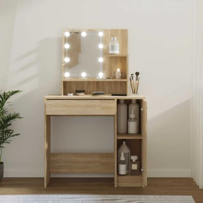 General description This stylish dressing table features refined straight lines and an asymmetrical shape, making it a striking addition to any room. The table is designed with functionality in mind, offering ample storage space and integrated LED lighting to enhance your beauty routine. Technical specifications Colour: Sonoma oak Material: Engineered wood, acrylic Dimensions: 86.5 x 35 x 136 cm (W x D x H) Power: DC 5V (USB power source not included) Ample storage space The makeup table includes: Open shelves on the tabletop A drawer A side cabinet Installation Each product comes with an assembly manual in the box for easy assembly. To prevent overturning, this product must be used with the wall attachment device provided. Usage The dressing table features LED bulbs that can switch between warm and cold white light, illuminating your beauty routine effectively. Ensure that all components are intact before use; do not use if any parts are broken, torn, or missing. Other information