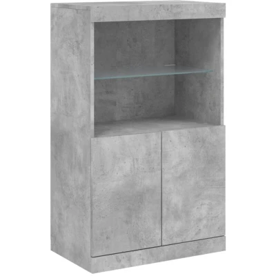 ManoManoGeneral description Enhance your living space with this modern sideboard featuring LED lights. Its sleek design in concrete grey allows it to seamlessly blend with various furniture styles, making it a versatile addition to any room. Technical specifications Dimensions: 60.5 x 37 x 100 cm (W x D x H) Material: Engineered wood, glass Power: DC 5V (USB power source not included) Usage Ideal for storing magazines, books, remote controls, and other small items. Perfect for displaying decorative objects, photo frames, or potted plants on the sturdy top surface. RGB LED lights can be customized to change colors and adjust automatically. Other information Warning: To prevent tipping, use the provided wall attachment device. Do not use if any components are broken, torn, or missing. Higher voltage may cause overheating and damage to the device.