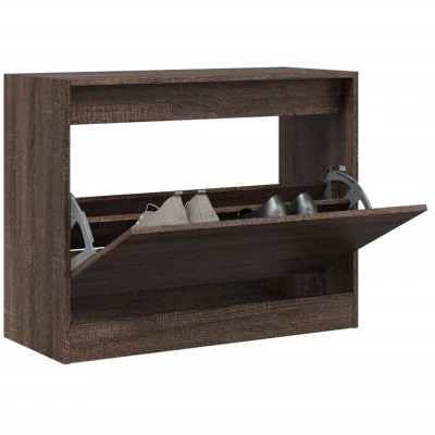 ManoManoGeneral description This shoe cabinet is an excellent choice for organizing your shoes, especially in tight and narrow spaces thanks to its compact design. The engineered wood construction ensures durability and moisture resistance, making it a practical addition to your home. Technical specifications Colour: Brown oak Material: Engineered wood Dimensions: 80 x 34 x 63 cm (W x D x H) Maximum load capacity: 30 kg Assembly required: Yes Usage This shoe rack features 1 flip drawer with 2 layers, providing ample space to keep your shoes within reach and well organized. The sturdy top of the shoe cupboard is ideal for displaying decorative objects, photo frames, or potted plants. To prevent it from tipping over, this product must be used with the provided wall attachment device. Other information