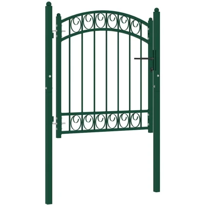General description This fence gate forms a practical security barrier for your garden, patio, or terrace. Thanks to its elegant arched top design and strong horizontal braces to reinforce the frame, this garden gate provides a high degree of security while forming a fabulous entryway onto your property. Manufactured from heavy-duty steel, the fence gate has a sturdy construction and has been powder coated against rust and corrosion. It comes with two solid posts along with sturdy hinges for easy installation, and a locking system with three matching keys is also included. Technical specifications Colour: Green Material: Powder-coated steel Overall size: 102 x 150 cm (W x H) Gate panel height: 100 cm Assembly required: Yes SKU: 146363 Other information