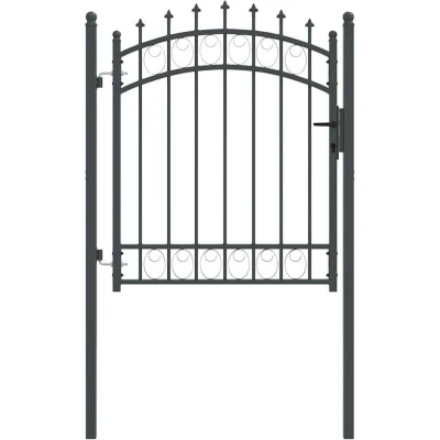 ManoManoGeneral description This elegant fence gate adds both functionality and modern aesthetics to any outdoor space. Tailor-made for garden and terrace areas, it combines a timeless design with security. Constructed from durable powder-coated steel, this rectangular gate is robust and weather-resistant, enhancing the overall look of your premises. The arched top design with its sleek spikes provides a statement of style while maintaining necessary safety and division in your garden. Technical specifications Colour: Grey Material: Powder-coated steel Overall dimensions: 104 x 172 cm (W x H) Weight: 15.55 kg Compatibility and accessories Includes: 1 x Fence gate 2 x Fence Posts Sturdy hinges 3 Matching keys Installation Assembly required: Yes Usage Indoor / outdoor: Outdoor use only Care & Maintenance: Easy to maintain with occasional wipes using a damp cloth. Other information