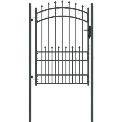 ManoManoGeneral description This fence gate with spikes embodies modern simplicity, featuring a sleek, powder-coated steel structure characterized by clean lines and minimal ornamentation. Designed explicitly for outdoor settings such as gardens and terraces, it offers an impressive combination of style and practicality. Its arched top design adds a touch of elegance, making it not just a piece of functional hardware, but also an aesthetically appealing feature for outdoor spaces. The robust construction ensures reliable performance in various weather conditions while offering a secure boundary solution. Technical specifications Colour: Grey Material: Powder-coated steel Overall dimensions: 103 x 197 cm (W x H) Weight: 19.35 kg Compatibility and accessories Included Components: 1 x Fence gate 2 x Fence Posts Sturdy hinges 3 Matching keys Installation Assembly requires two individuals and a screwdriver for quick setup. The components ensure stability and safety once installed. Usage Perfectly