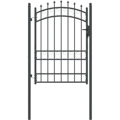 ManoManoGeneral description This elegant fence gate adds both functionality and modern aesthetics to any outdoor space. Tailor-made for garden and terrace areas, it combines a timeless design with security. Constructed from durable powder-coated steel, this rectangular gate is robust and weather-resistant, enhancing the overall look of your premises. The arched top design with sleek spikes provides a statement of style while maintaining necessary safety and division in your garden. Technical specifications Colour: Grey Material: Powder-coated steel Overall dimensions: 104 x 197 cm (W x H) Weight: 19.5 kg Indoor / outdoor: Outdoor use only EAN: 8721288882363 SKU: 42008990 Brand: vidaXL Compatibility and accessories Includes: 1 x Fence gate 2 x Fence Posts Sturdy hinges 3 Matching keys Installation Assembly required: Yes Complete set simplifies assembly and assures stability upon installation. Usage Easy to maintain; requires only an occasional wipe with a damp cloth. Durable finish prevents