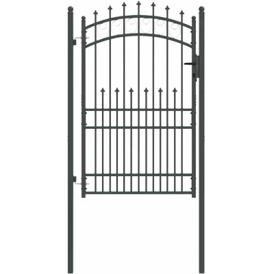 ManoManoGeneral description This fence gate with spikes embodies modern simplicity, featuring a sleek, powder-coated steel structure characterized by clean lines and minimal ornamentation. Designed explicitly for outdoor settings such as gardens and terraces, it offers an impressive combination of style and practicality. Its arched top design adds a touch of elegance, making it not just a piece of functional hardware, but also an aesthetically appealing feature for outdoor spaces. The robust construction ensures reliable performance in various weather conditions while offering a secure boundary solution. Technical specifications Colour: Grey Material: Powder-coated steel Overall dimensions: 103 x 210 cm (W x H) Weight: 14.7 kg Included Components 1 x Fence gate 2 x Fence Posts Sturdy hinges 3 Matching keys Assembly and Maintenance Assembly requires two individuals and a screwdriver for quick setup. Regular checks of hinges and bolts are recommended for longevity. Cleaning the surface with a