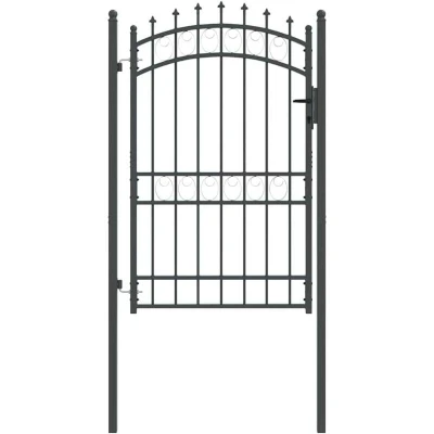 ManoManoGeneral description This elegant fence gate adds both functionality and modern aesthetics to any outdoor space. Tailor-made for garden and terrace areas, it combines a timeless design with security. Constructed from durable powder-coated steel, this rectangular gate is robust and weather-resistant, enhancing the overall look of your premises. The arched top design with sleek spikes provides a statement of style while maintaining necessary safety and division in your garden. Technical specifications Colour: Grey Material: Powder-coated steel Overall dimensions: 104 x 210 cm (W x H) Weight: 20 kg Compatibility and accessories Includes: 1 x Fence gate 2 x Fence Posts Sturdy hinges 3 Matching keys Installation Assembly required: Yes Complete set simplifies assembly and assures stability upon installation. Usage Indoor / outdoor: Outdoor use only Easy to maintain; requires only an occasional wipe with a damp cloth. Other information