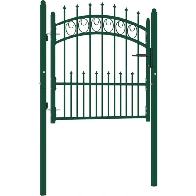 VidaXLThis fence gate forms a practical security barrier for your garden, patio or terrace. Manufactured from heavy-duty steel, the fence gate has a sturdy construction and has been powder coated against rust and corrosion. With the vertical bars featuring spikes and strong horizontal brace as the reinforcement, this garden gate provides a high degree of security. The arched top design adds to its elegance. It comes with two solid posts along with sturdy hinges for easy installation, and a locking system with three matching keys is also included in delivery.