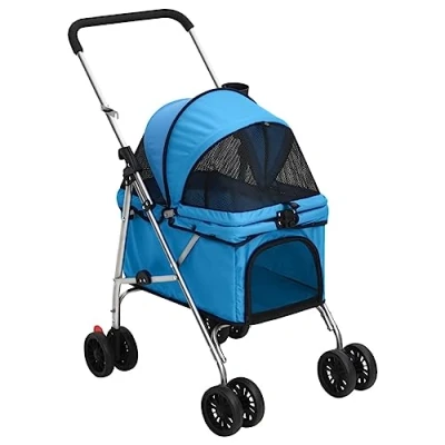 Amazon【Optimum Ventilation】: Features breathable mesh for maximum ventilation and visibility, also protects pets from s 【Robust Materials】: Made with durable 300D oxford fabric and strong steel framework. Available in blue color 【Pet Comfort】: Folding dog stroller with sunroof to shield your pet from harsh sunlight, ensuring cozy seating with a leash for added safety 【Flexible Maneuverability】: This puppy pushchair has frontal wheels that revolve in all directions and rear wheels with brakes for easy handling and parking control 【Portable Design】: Compact and foldable dog gy, perfect for easy storage and convenient transportation