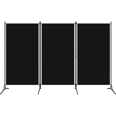 ManoManoGeneral description The freestanding 3-panel room divider is an ideal solution for creating partitions, providing privacy, or enhancing your decor. Its lightweight design allows for easy mobility, making it perfect for use in various spaces such as bedrooms or living areas. The divider can be conveniently folded when not in use, and its stable foot pedestal ensures it remains securely in place. Technical specifications Colour: Black Material: Fabric (100% polyester), powder-coated iron Overall size: 260 x 180 cm (W x H) Fabric screen size (each): 85 x 174 cm (W x H) Number of panels: 3 Assembly required: Yes Other information Note: The fabric does not block all light completely.
