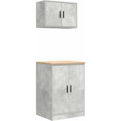 ManoManoGeneral description These garage cabinets are an excellent choice for organizing all your DIY tools and materials in the garage, storage room, or workshop. Made from durable pinewood and engineered wood, they ensure stability and sturdiness for long-lasting use. Technical specifications Colour: Concrete grey Assembly required: Yes Max. weight capacity: 60 kg Garage storage cabinet: Worktop material: Solid pinewood (untreated) Cabinet material: Engineered wood Dimensions: 60 x 51 x 85 cm (W x D x H) Max. weight capacity (per shelf): 20 kg Garage wall cabinet: Material: Engineered wood Dimensions: 60 x 30 x 41 cm (W x D x H) Compatibility and accessories Screws and plugs for inside the wall are not included. It is advised to find and use screws and plugs suitable specifically for your walls. Installation Flexible door installation: The door of the compartment can be installed on the left or right according to your personal habits and convenience. Warning: To prevent it from tipping