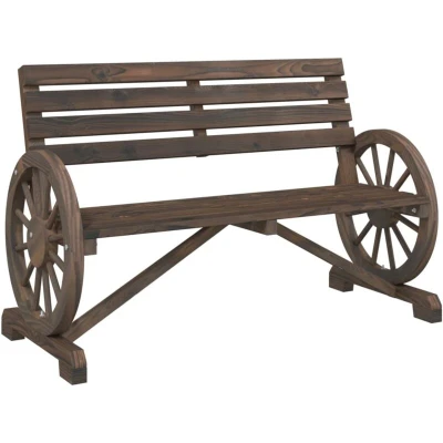 General description This wooden garden bench will make a great addition to your garden, patio, or terrace, allowing you to enjoy a cozy time with your family or friends. Made from solid fir wood, this bench is both beautiful and durable, maintaining its integrity even when exposed to moisture. It does not dry out or warp, making it a reliable choice. The backrest and armrests provide extra seating comfort, while the attractive wagon wheel design of the armrests offers an eye-catching display from every angle. Technical specifications Material: Solid fir wood with a burnt look Dimensions: 121.5 x 57 x 77.5 cm (W x D x H) Seat size: 113.5 x 35 cm (W x D) Seat height from the ground: 39.5 cm Armrest height from the ground: 57.5 cm Maximum load capacity (per seat): 110 kg Assembly required: Yes Cushion included: No Other information To maintain the beauty of your outdoor furniture, it is recommended to protect it with a waterproof cover.