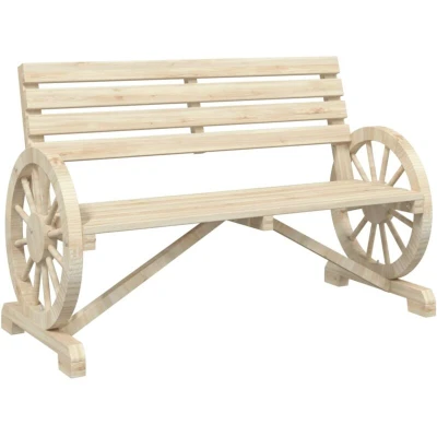 General description This wooden garden bench will make a great addition to your garden, patio, or terrace, allowing you to enjoy a cozy time with your family or friends. Made from solid fir wood, it is a beautiful and durable material that maintains its integrity even when exposed to moisture. The backrest and armrests provide extra seating comfort, while the attractive wagon wheel design of the armrests offers an eye-catching display from every angle. Technical specifications Material: Solid fir wood Dimensions: 121.5 x 57 x 77.5 cm (W x D x H) Seat size: 113.5 x 35 cm (W x D) Seat height from the ground: 39.5 cm Armrest height from the ground: 57.5 cm Maximum load capacity (per seat): 110 kg Assembly required: Yes Cushion included: No Other information To ensure your outdoor furniture stays beautiful, it is recommended to protect it with a waterproof cover.