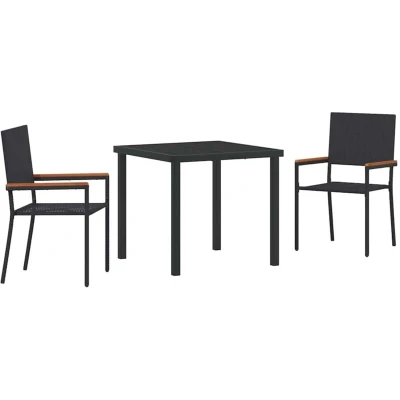 ManoManoGeneral description This modern garden dining set combines style and functionality, making it an ideal choice for outdoor living. With its sleek lines and minimalist design, it enhances any garden or terrace, providing a comfortable space for relaxation or entertaining guests. Technical specifications Colour: Black Material: Poly rattan Seat width: 49 cm Seat depth: 38 cm Assembly required: Yes Included components: 2 x Garden chairs, 1 x Garden table EAN: 8721288646224 SKU: 3379702 Brand: vidaXL Installation Easy to assemble with just a screwdriver required. Usage Perfect for enhancing gardens and terraces, providing a stylish and comfortable area for outdoor gatherings. Materials are resistant to UV and water, ensuring durability in various weather conditions. Other information
