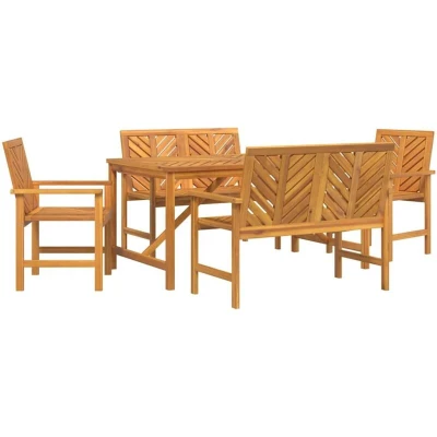 ManoManoGeneral description The Wooden Garden Dining Set is a lovely mix of function and straightforward style for your outdoor areas. With its minimalist vibe, it showcases clean lines and the natural charm of solid acacia wood, creating a look that fits right in with various garden environments. It’s perfect for hosting small, intimate meals, making for a lovely focal point wherever you set it up, whether that's a terrace or a garden—ideal for laid-back get-togethers or just some quiet time. Technical specifications Colour: Brown Material: Solid acacia wood Overall dimensions: 150 x 90 x 74 cm (L x W x H) Weight: 48.8 kg Frame material: Solid acacia wood Indoor / outdoor: Outdoor only Maximum weight capacity: 110 kg per seat Number of items: 5 (2 benches, 2 chairs, 1 table) Assembly required: Yes EAN: 8720845689360 SKU: 3154109 Brand: vidaXL Maintenance & Care Keeping it in shape is easy—just wipe it down with a damp cloth and protect it with covers when you’re not using it. This helps keep