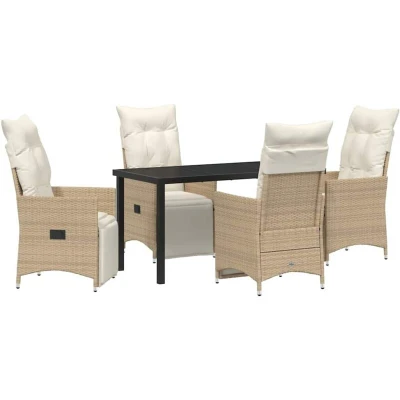 ManoManoGeneral description This garden dining set perfectly combines practicality with modern looks, providing a classy yet comfortable spot for outdoor gatherings. Its sharp lines and minimalist style blend seamlessly with any garden or terrace, creating a lovely place to unwind and connect with others. The soft textures and bold dark tones of the set contribute to a sophisticated and contemporary feel. Whether you’re hosting a summer brunch or enjoying a good book in the sun, this set ensures your comfort with its adjustable features. Technical specifications Colour: Beige Material: Poly rattan Seat width: 47 cm Seat depth: 50.5 cm Assembly required: Yes Delivery contains: 4 x Reclining chairs 1 x Garden table 4 x Seat cushions 4 x Back cushions EAN: 8721288645050 SKU: 3379585 Brand: vidaXL Compatibility and accessories Reclining mechanism with adjustable backrest Weather-resistant outdoor cushions with zip fastening for easy cleaning Flat armrests made from poly rattan for added comfort