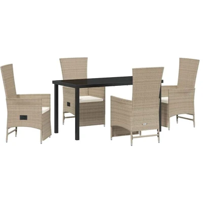 ManoManoGeneral description The Garden Dining Set with Cushion is a stylish and comfortable outdoor furniture solution, perfect for gardens and terraces. Its modern design features a trendy woven look in neutral shades, making it a great addition to various outdoor styles. This well-thought-out set enhances your outdoor living experience, providing a cozy spot for sunny days or relaxing evenings with loved ones. Technical specifications Material: Poly Rattan Colour: Beige Maximum weight capacity: 110 kg per seat Included Components 4 x Garden chairs 1 x Garden table with tempered glass top 4 x Weather-resistant seat cushions with zip for easy cleaning Features / Function / Design Reclining mechanism for adjustable backrests Lightweight construction for easy mobility Durable and UV-resistant materials suitable for outdoor use Care & Maintenance Use a cover to protect the set during inclement weather Avoid harsh cleaners to maintain the quality Regularly wash the removable cushion covers to