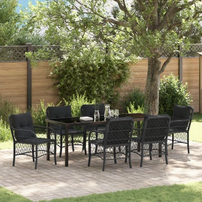 This Modern Garden Dining Set redefines outdoor elegance with its powder-coated steel frame paired with poly rattan, presenting a chic, minimalist style perfect for alfresco dining. Its sleek lines create a welcoming table setting, ideal for gatherings with family or friends on sun-drenched patios or in private garden enclaves. The set brings a modern flair to your outdoor space, blending functionality with atmosphere, making every meal outside an occasion. Modern Construction: Meticulously designed using powder-coated steel and poly rattan, ensuring a sturdy yet visually appealing structure. This material combination makes the set resilient against outdoor elements, promising longevity and a fresh appearance, perfect for outdoor gatherings. Comfort Enhancements: The set includes seat cushions crafted with weather-resistant outdoor fabric. These cushions, equipped with removable covers, combine comfort with practicality, making it easy to maintain their cleanliness and freshness. Stylish Tempered Glass Surface: A chic tempered glass tabletop that complements the sleek black frame adds sophistication and ease to your dining area. It's easy to clean, providing convenience while enhancing the aesthetic appeal of your outdoor dining space. Simplified Maintenance: Designed with straightforward care in mind, use a cover when not in use to protect the set from weather exposure. This easy upkeep ensures a lasting, pristine condition, ready for any unexpected garden soirees. Ergonomic Armrests: Thoughtfully crafted flat poly rattan armrests provide ergonomic comfort, supporting relaxed dining, whether enjoying casual meals or festive outdoor celebrations with family and friends.