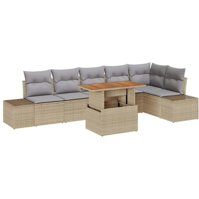 ManoManoGeneral description This modular garden dining set is perfect for modern outdoor spaces, combining style and functionality. With its sleek design and adjustable setup, it’s ideal for garden parties or relaxing evenings. The set offers ample seating and is constructed from durable poly rattan and acacia wood, ensuring it withstands outdoor conditions while providing comfort for all your gatherings. Technical specifications Colour: Beige and grey Material: Poly rattan, powder-coated steel, and solid acacia wood Overall dimensions: 100 x 55 x 73 cm (L x W x H) Weight: 60.7 kg Seating area: 55 x 55 cm (W x D) Frame material: Powder-coated steel Filling material: Foam Includes 6 pillows Indoor / outdoor: Outdoor only Assembly required: Yes Number of items: 7 Compatibility and accessories Includes: 2 x Side sofas with storage function 1 x Corner seat with storage function 3 x Centre seats with storage function 1 x Garden table Installation Assembly required for setup. Usage Ideal for garden