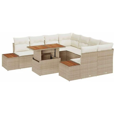 ManoManoGeneral description This modular outdoor furniture set mixes modern style with practicality, perfect for gardens and terraces. It has clean lines and a contemporary vibe that guarantees comfort and good looks. Ideal for get-togethers, it offers plenty of seating for family and guests, really sprucing up any outdoor area with its classy look. Technical specifications Colour: Beige and cream Material: Poly rattan, powder-coated steel, and solid acacia wood Overall dimensions: 100 x 55 x 73 cm (L x W x H) Weight: 77.9 kg Seating area: 55 x 55 cm (W x D) Seat cushion removable: Zip fastening Filling material: Foam With 9 pillows Indoor / outdoor: Outdoor only Number of items: 9 Included Components 2 x Side sofa including storage function 2 x Corner seat including storage function 4 x Centre seat including storage function 1 x Garden table Care & Maintenance For a long life, cover the set when you’re not using it. Give it a gentle clean with a brush now and then to keep it looking good.