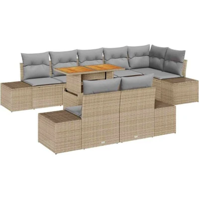 ManoManoGeneral description This modular garden dining set is a versatile outdoor choice made from poly rattan, steel, and solid Acacia wood. It is designed to fit various outdoor spaces while offering comfort and style. The modern look features straightforward, clean lines, perfect for those who appreciate a minimalist aesthetic. This set is ideal for transforming your terrace or garden into a welcoming outdoor oasis for friends and family. Technical specifications Colour: Beige and grey Material: Poly rattan, steel, and solid Acacia wood Overall dimensions: 100 x 55 x 73 cm (L x W x H) Weight: 60.7 kg Seating area: 55 x 55 cm (W x D) Frame material: Powder-coated steel Filling material: Foam Number of items: 9 Assembly required: Yes EAN: 8721158230935 SKU: 3349979 Compatibility and accessories Includes: 4 x Side sofas with storage function 1 x Corner seat with storage function 3 x Centre seats with storage function 1 x Garden table With 8 pillows Installation Assembly required: Yes Usage