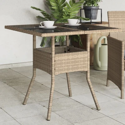 ManoManoGeneral description This garden table with a glass top, designed with clean and simple lines, is an excellent choice for your garden, patio, and other outdoor spaces. Technical specifications Dimensions: 80 x 80 x 75 cm (L x W x H) Material: PE rattan, powder-coated steel, tempered glass Colour: Beige UV-resistant Assembly required: Yes Usage Lightweight and easy to clean, making it suitable for outdoor furniture. To maintain its appearance, it is recommended to protect it with a waterproof cover. Other information