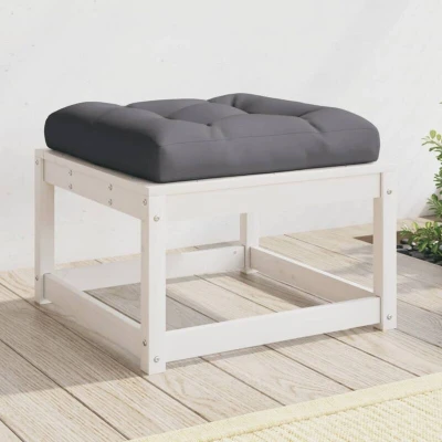 ManoManoGeneral description This wooden garden footstool is a perfect addition to your garden, terrace, or patio, ideal for chatting with family and friends or simply enjoying the weather. Made from solid pine wood, it offers durability and stability while showcasing a beautiful natural finish with a rustic look. Technical specifications Colour: White Material: Solid pine wood Dimensions: 83 x 73 x 78 cm (W x D x H) Seat size: 63.5 x 63.5 cm (W x D) Seat cushion thickness: 12 cm Maximum load capacity: 130 kg Cushion colour: Anthracite Seat cushion dimensions: 60 x 60 x 12 cm (L x W x T) Cover material: Polyester Filling material: Polyester Assembly required: Yes Usage This outdoor ottoman can be used for sitting or resting your feet. It can also serve as a coffee table for drinks, food, and decorations. Other information To maintain the beauty of your outdoor furniture, it is recommended to protect it with a waterproof cover. Delivery contains: 1 x Garden footstool, 1 x Seat cushion