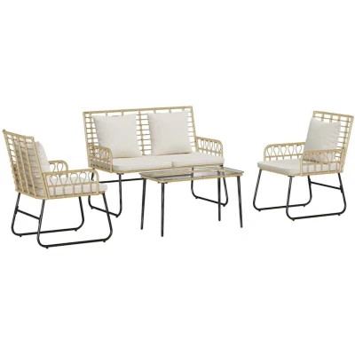 This modern garden furniture set seamlessly combines style and functionality, elevating any outdoor space with its sleek design. Ideal for spring and summer gatherings, its clean lines and minimal ornamentation offer a contemporary vibe, providing a perfect blend of aesthetics and practicality for your garden or terrace. High-Quality Materials: Crafted from premium poly rattan, this set boasts superior durability and a refined aesthetic, ideal for outdoor use. The material's quick-drying features ensure resilience against light rain and dew, prolonging its life and retaining its appearance through spring and summer seasons. Comprehensive Components: The set includes two garden chairs, a bench, and a coffee table, all featuring weather-resistant materials. The frame and legs are constructed of steel, providing a stable structure. The powder-coated finish on the frame offers additional protection against and weather damage. Durable Features: Each component of the set is designed to withstand UV radiation without degradation. This ensures the materials retain their strength and color, while also ensuring that your outdoor furniture maintains its stylish look through sunny days. Perfect for Various Uses: Designed for garden and terrace areas, this set adapts seamlessly to different outdoor spaces. It creates a comfortable area for relaxation, social gatherings, or quiet evenings alone, accommodating different user needs effortlessly. Care &Maintenance Tips: Use a cover when not in use to keep your furniture set free from dust and weather-related damage. This practice extends the life of the set, keeping it fresh and ready for use at any time, with minimal upkeep required.