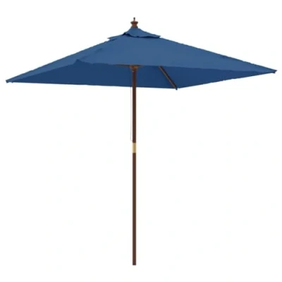 General description This garden parasol is perfect for creating shade and protecting you from the sun's harmful UV rays. Made of durable, UV-protective, and anti-fade polyester, it provides optimum protection against the sun and is easy to clean. The strong hardwood pole and durable ribs ensure stability and durability, while the wind vent allows for heat and wind venting, making it an excellent choice for outdoor living. The parasol features a single pulley system for easy opening and closing. Technical specifications Colour: Azure blue Frame material: Solid hardwood with teak colour, laminated bamboo Cover material: Fabric (100% polyester) Overall dimensions: 198 x 198 x 231 cm (W x D x H) Pole diameter: 38 mm Includes 4 ribs Features air vent Assembly required: Yes Other information This product is not 100% waterproof. It is recommended to treat this product with a waterproof spray for better water resistance. SKU: 363190