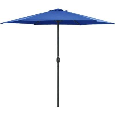 General description This garden parasol is ideal for creating shade and protecting you from the sun's harmful UV rays. Made from UV protective and anti-fade polyester, the parasol cover offers excellent sun protection and is easy to clean. The strong aluminium pole, combined with 6 sturdy steel ribs, ensures stability and durability. The garden umbrella features a convenient crank mechanism for easy opening and closing, and it is simple to assemble. Technical specifications Colour: Azure blue Material: Fabric (100% polyester), aluminium Overall dimensions: 270 x 246 cm (Diameter x H) Pole diameter: 38 mm Includes air vent and crank mechanism Number of ribs: 6 Assembly required: Yes Other information Please note that it is recommended to treat the umbrella fabric with a waterproofing spray if it is exposed to heavy rainfall.