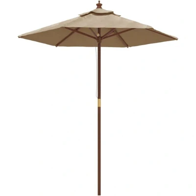General description This garden parasol is perfect for creating shade and protecting you from the sun's harmful UV rays. Made from durable, UV-protective, and anti-fade polyester, it offers optimum protection against the sun while being easy to clean. The strong hardwood pole and durable ribs ensure stability and longevity, while the wind vent allows for heat and wind venting, making it an excellent choice for outdoor living. The parasol features a single pulley system for easy opening and closing. Technical specifications Colour: Taupe Frame material: Solid hardwood with teak colour, laminated bamboo Cover material: Fabric (100% polyester) Overall dimensions: 196 x 231 cm (Diameter x H) Pole diameter: 38 mm Includes 6 ribs Assembly required: Yes Other information This product is not 100% waterproof. It is recommended to treat it with a waterproof spray for better water resistance.